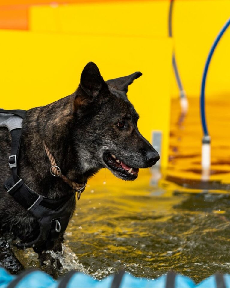 Un parcours aquatique sinueux à suivre dans l’eau. Le chien progresse à travers les différents passages pour atteindre la zone d’arrivée.